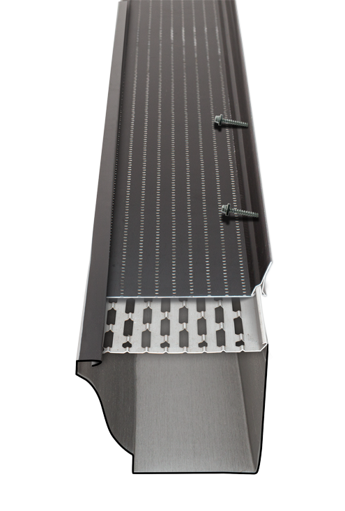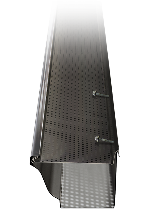 The DoublePro Microfiltration Continuous Hanger™ keeps debris from getting inside the gutter. The offset holes make it the perfect filter, allowing water to drain freely while blocking pine needles and leaves without ever getting clogged.